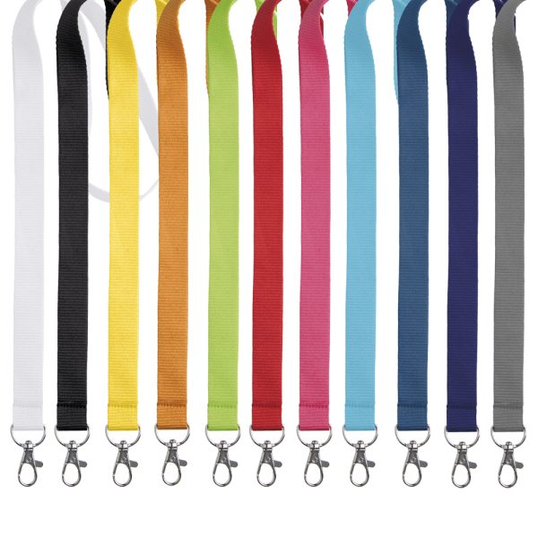 Lanyard em poliéster e mosquetão.